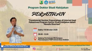 Program Doktor Studi Kebijakan Fakultas Ilmu Sosial dan Ilmu Politik Universitas Andalas menyelenggarakan Pelatihan Penelusuran Sumber Kepustakaan di Internet pada Sabtu, 18 Oktober 2025, pukul