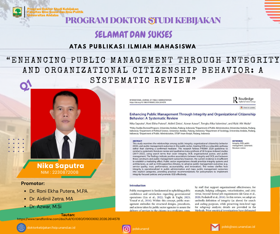 Artikel ini telah diterbitkan dalam jurnal ilmiah internasional yaitu International Journal of Public Administration (IJPA). Publikasi ini merupakan bentuk kontribusi nyata dalam pengembangan ilmu kebijakan.